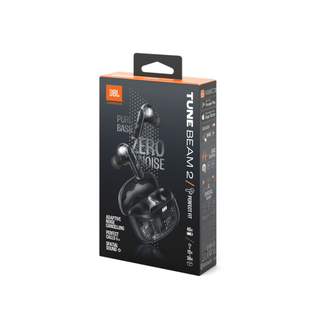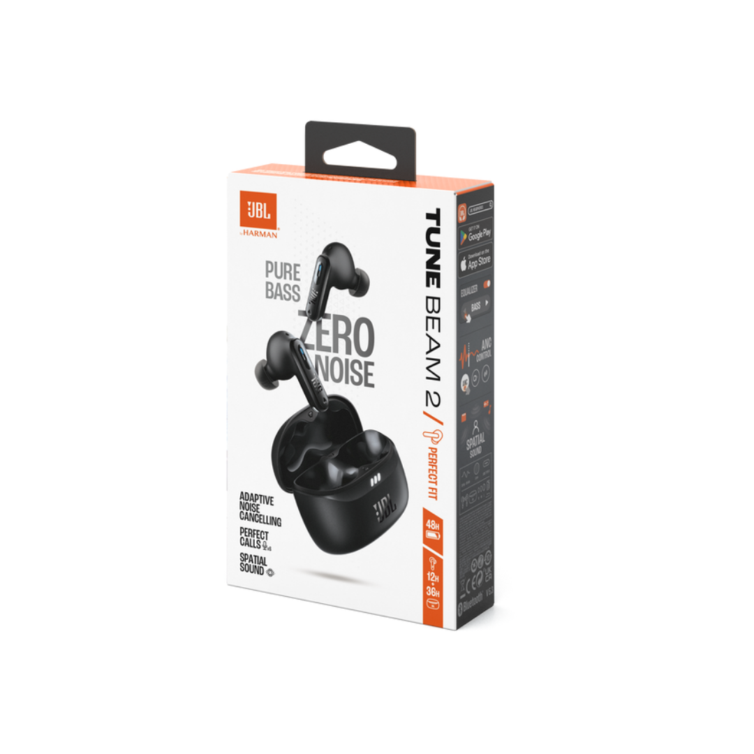 Auriculares JBL Tune Beam 2 True Wireless con sonido JBL Pure Bass y Spatial, cancelación de ruido adaptativa Smart Ambient, hasta 48 h de reproducción total, conectividad Bluetooth 5.3 y resistencia al agua y polvo IP54. Controles táctiles intuitivos y emparejamiento rápido. Disponible en SUTOA El Salvador.