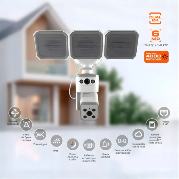 La Cámara Inteligente Wi-Fi Doble Lente con Reflector Nexxt Solutions NHC-FP50DL es una cámara de seguridad avanzada para exteriores con doble lente PTZ + fija, resolución 2K QHD, visión nocturna en color, reflector LED 4000 lúmenes y detección inteligente de movimiento. Ideal para proteger tu hogar o negocio con funciones inteligentes integradas, compatible con Alexa y Google Assistant y conectividad Wi-Fi/RJ45.