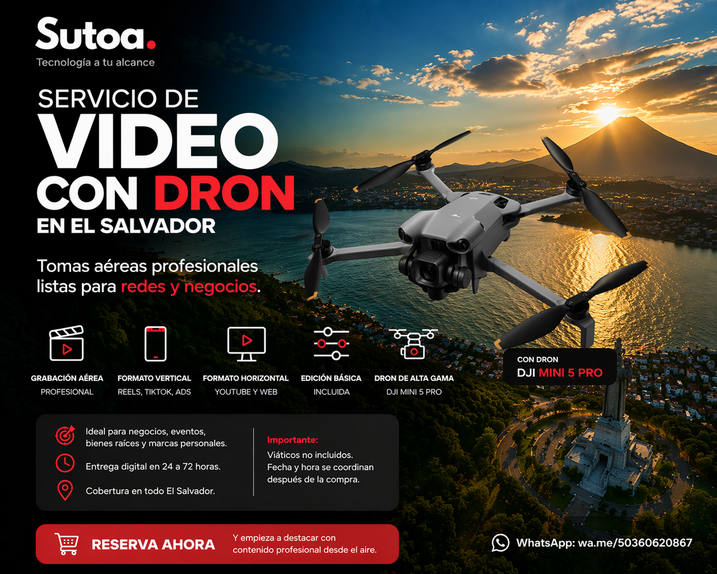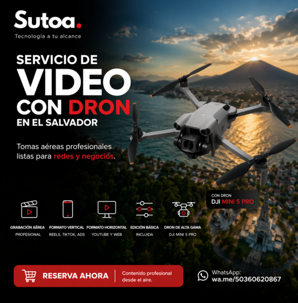Contenido profesional con tomas aéreas con dron listas para redes sociales, ideal para negocios, eventos y marcas personales que buscan destacar con video de alto impacto. Incluye clips optimizados y videos editados en formato vertical y horizontal, listos para publicar en Instagram, TikTok y YouTube. Disponible en SUTOA para contratación en El Salvador.